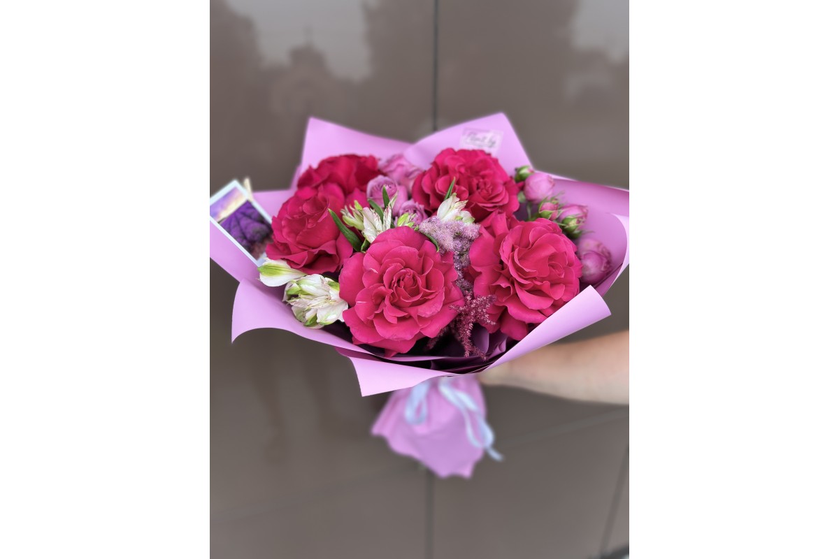 Состав:  5 французских роз, альстромерия ,кустовая Роза , упаковка, лента.
