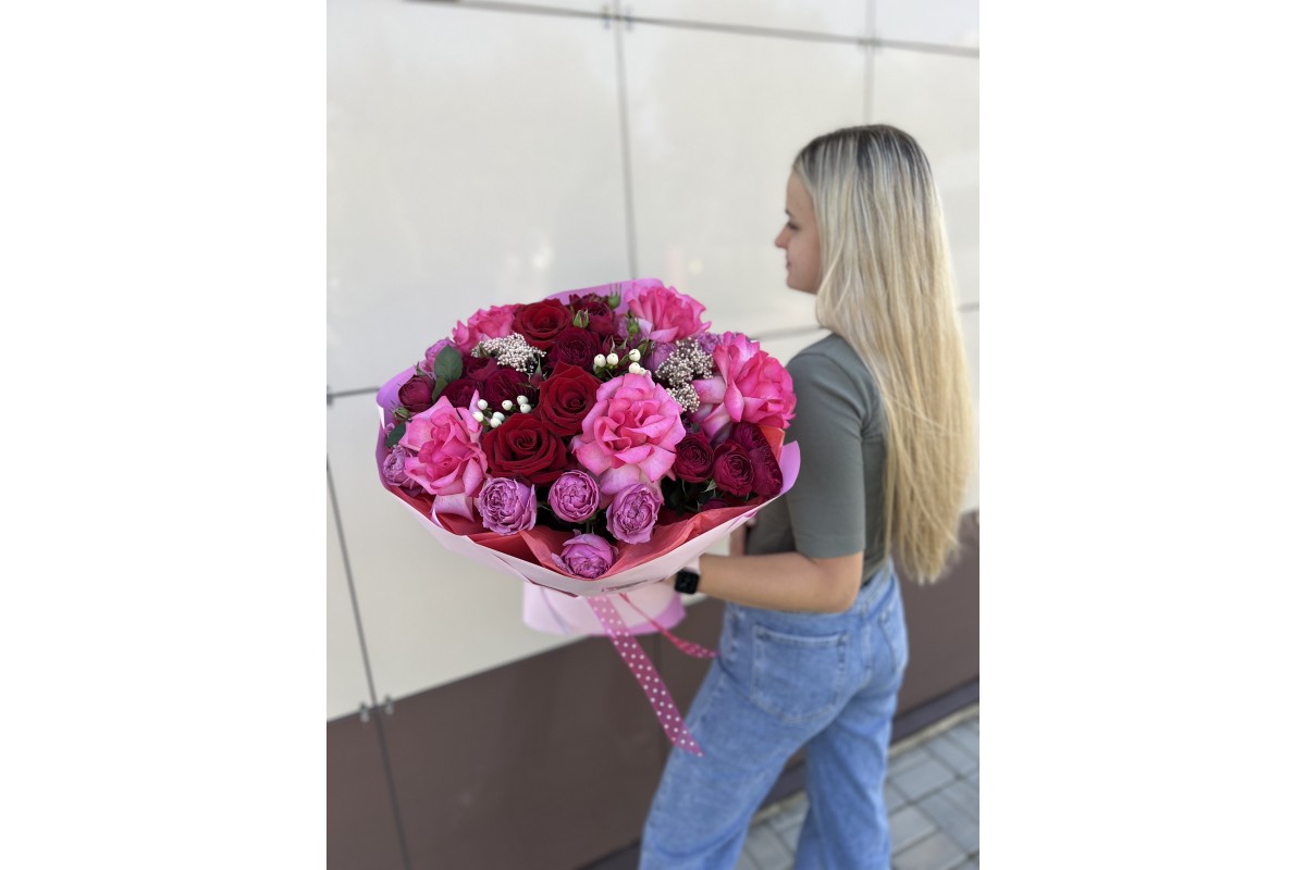 Состав:  Французская Роза , кустовая Роза, эвкалипт, альстромерия , ваксфлор, упаковка, лента.