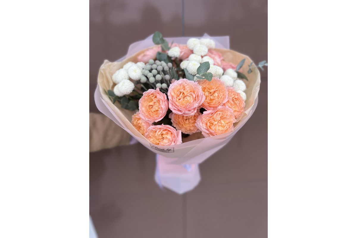 Состав: кустовая роза,хризантема, бруния, эвкалипт, упаковка, сумка-переноска.