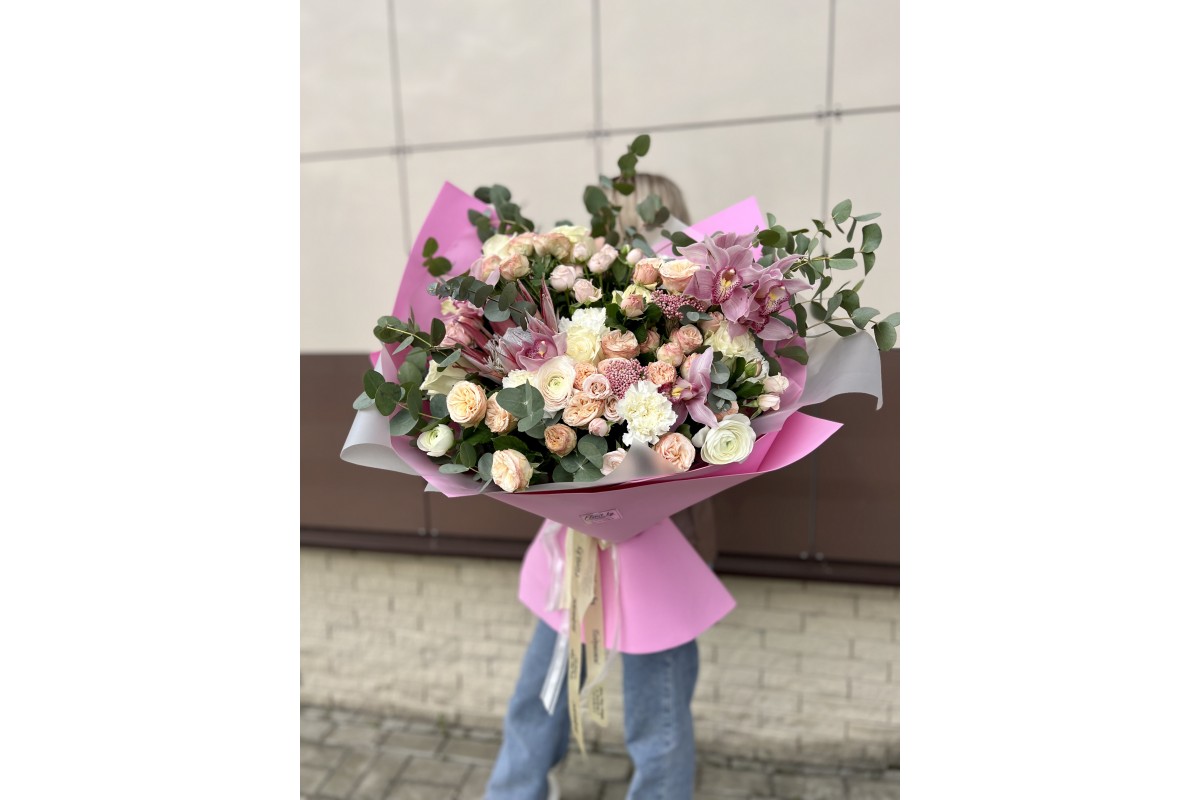 Состав: Кустовые розы, орхидея, озатамнус, протея, эвкалипт, упаковка, лента.