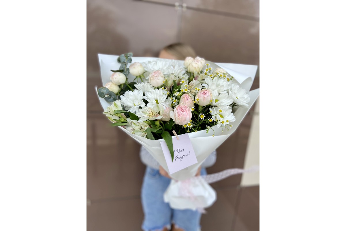 Состав: Хризантема, кустовая роза, роза, бруния, альстромерия , зелень , упаковка, лента.