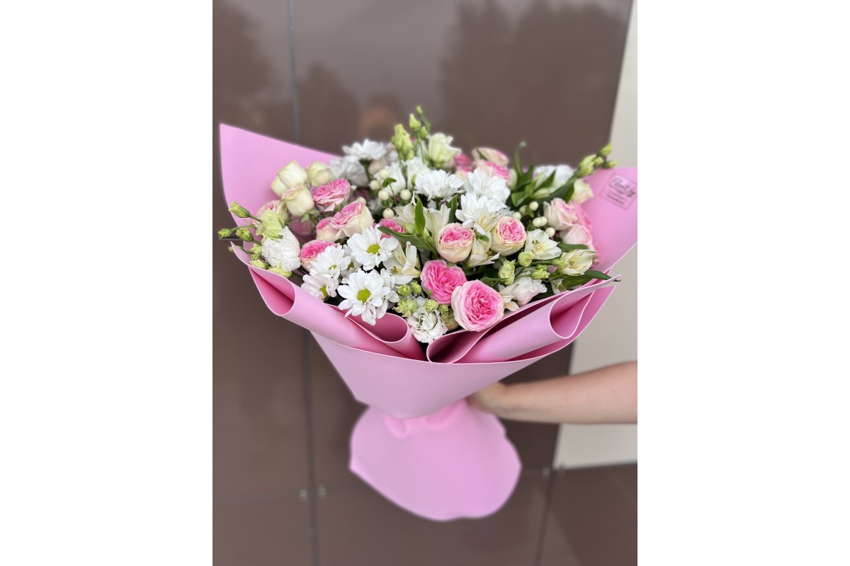 Состав:  кустовые розы, хризантемы, Эустома, альстромерия, гиперикум, упаковка, лента.