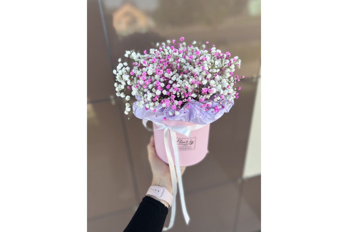 Состав: гипсофила цветная, лента, флорпена, коробка.