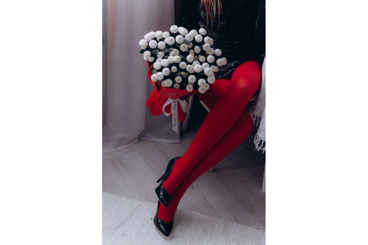 Состав: 7 веток кустовой хризантемы кокос, упаковка, лента.