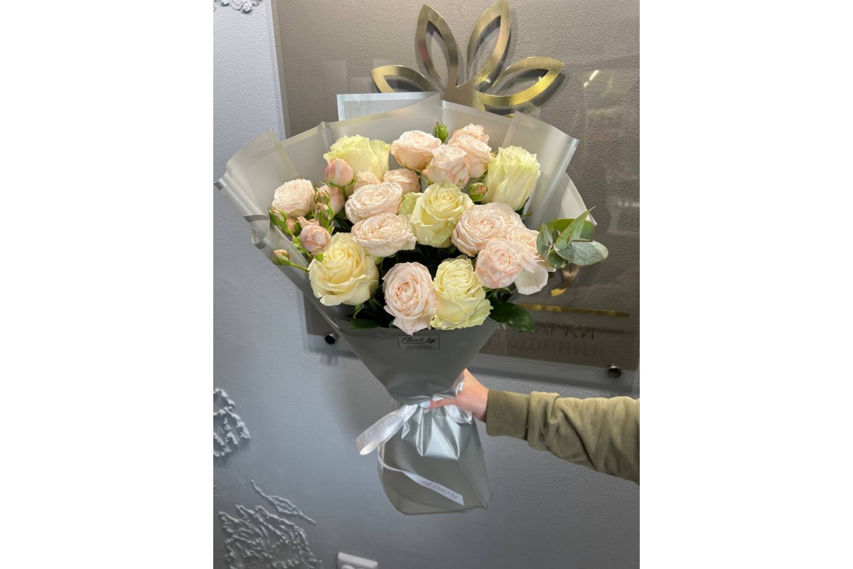 Состав: кустовая Роза, роза , зелень , упаковка, лента.