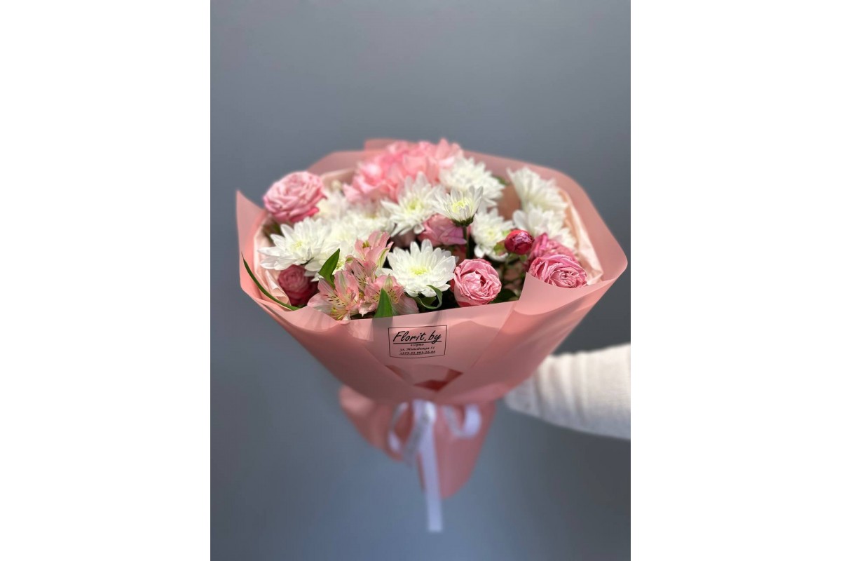 Состав: 1Французская  роза, 2 кустовые розы,3 хризантемы , 1 альстромерия, лента.