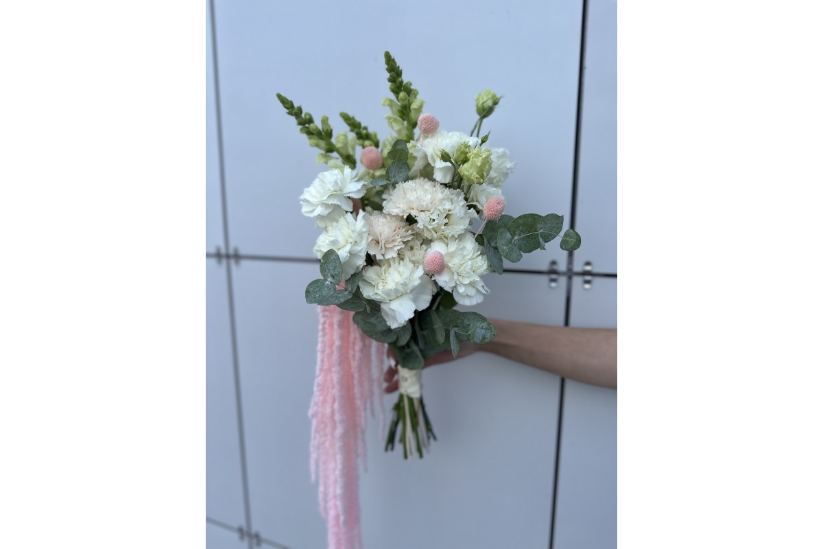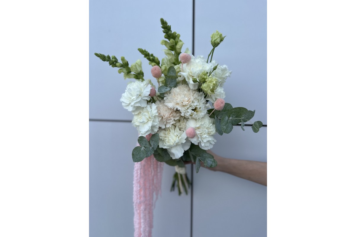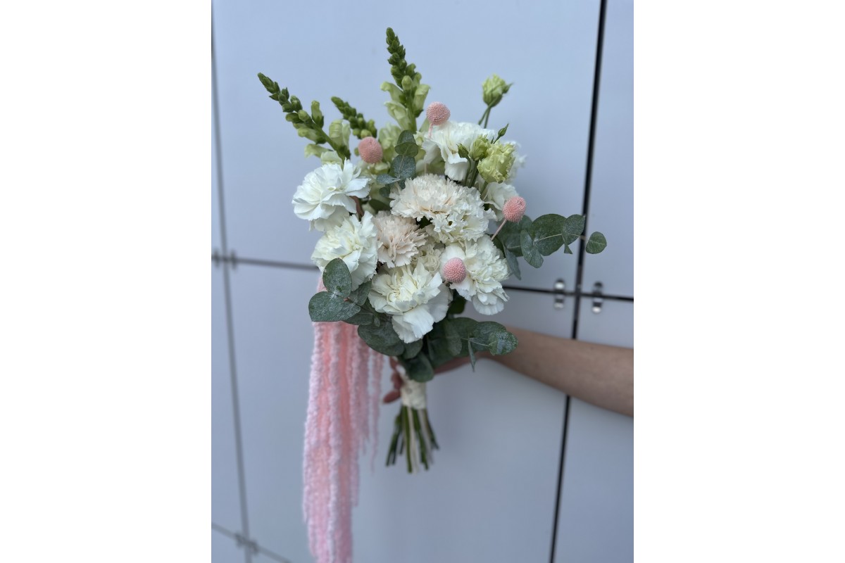 Состав: диантусы,эвкалипт ,маттиола , лента.