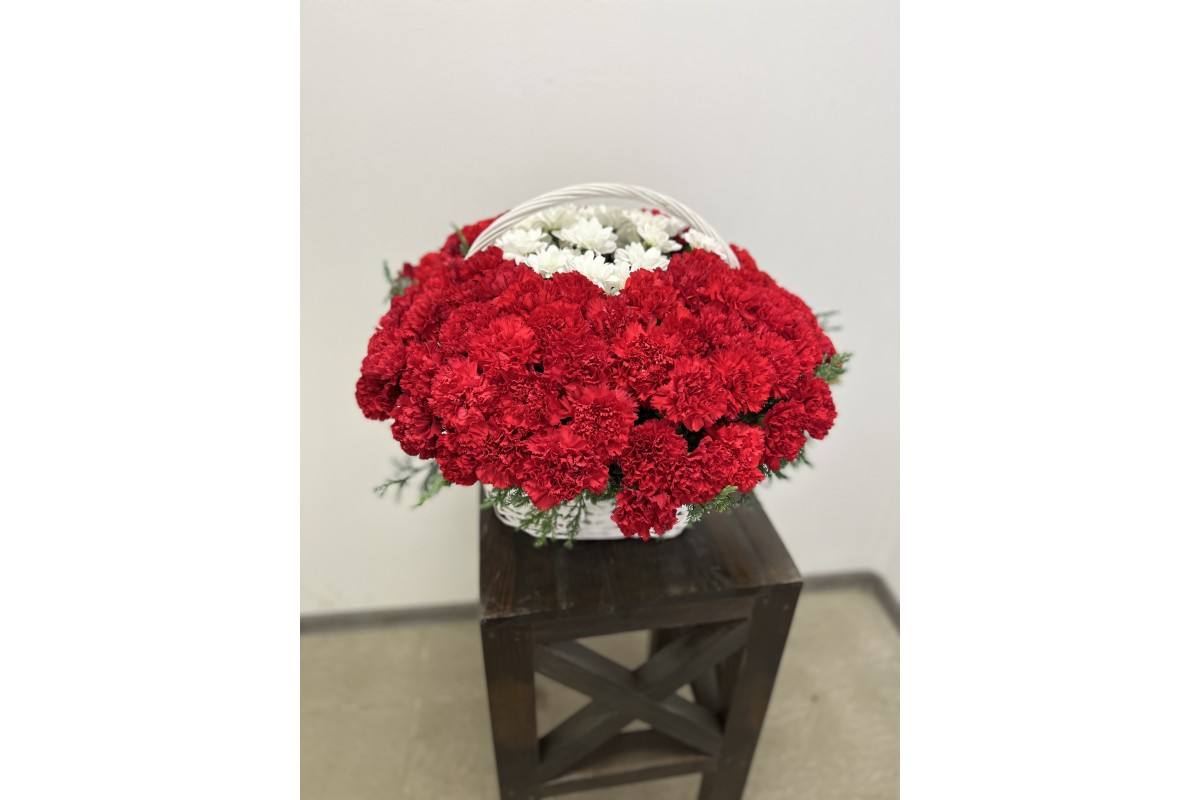 Состав: Гвоздики около 75 шт, хризантемы 6 шт, флорпена, корзина