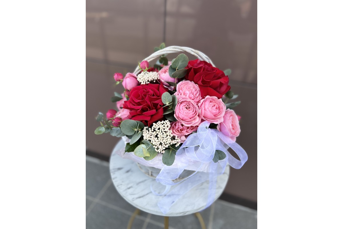 Состав: французская Роза, кустовая Роза, озатамнус, эвкалипт, корзина, губка, лента.