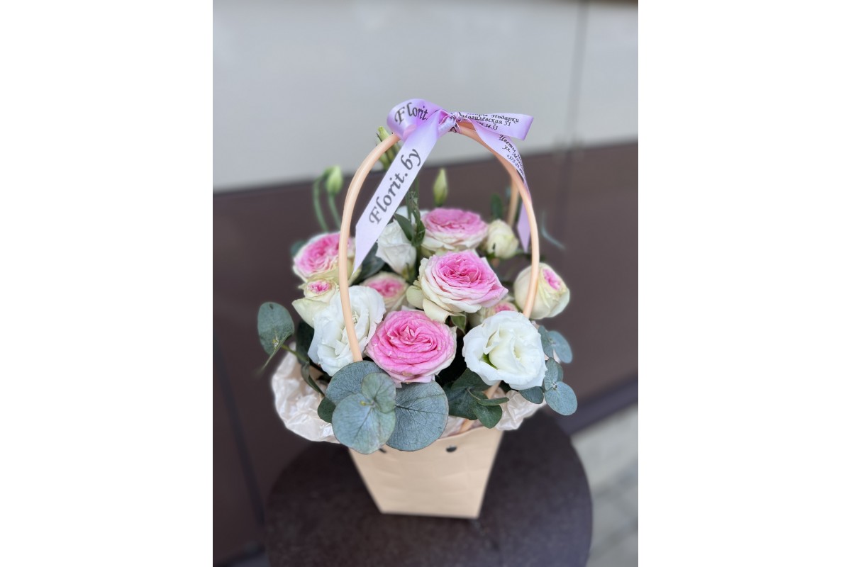 Состав: кустовая роза, эустома, зелень, лента, флористическая губка, корзина.