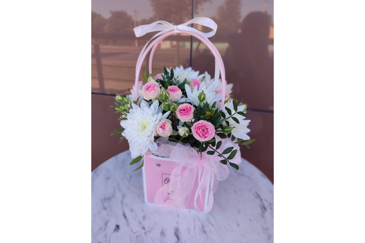 Состав:  Роза ,кустовая роза, хризантемы , зелень, лента, флористическая губка, сумка.