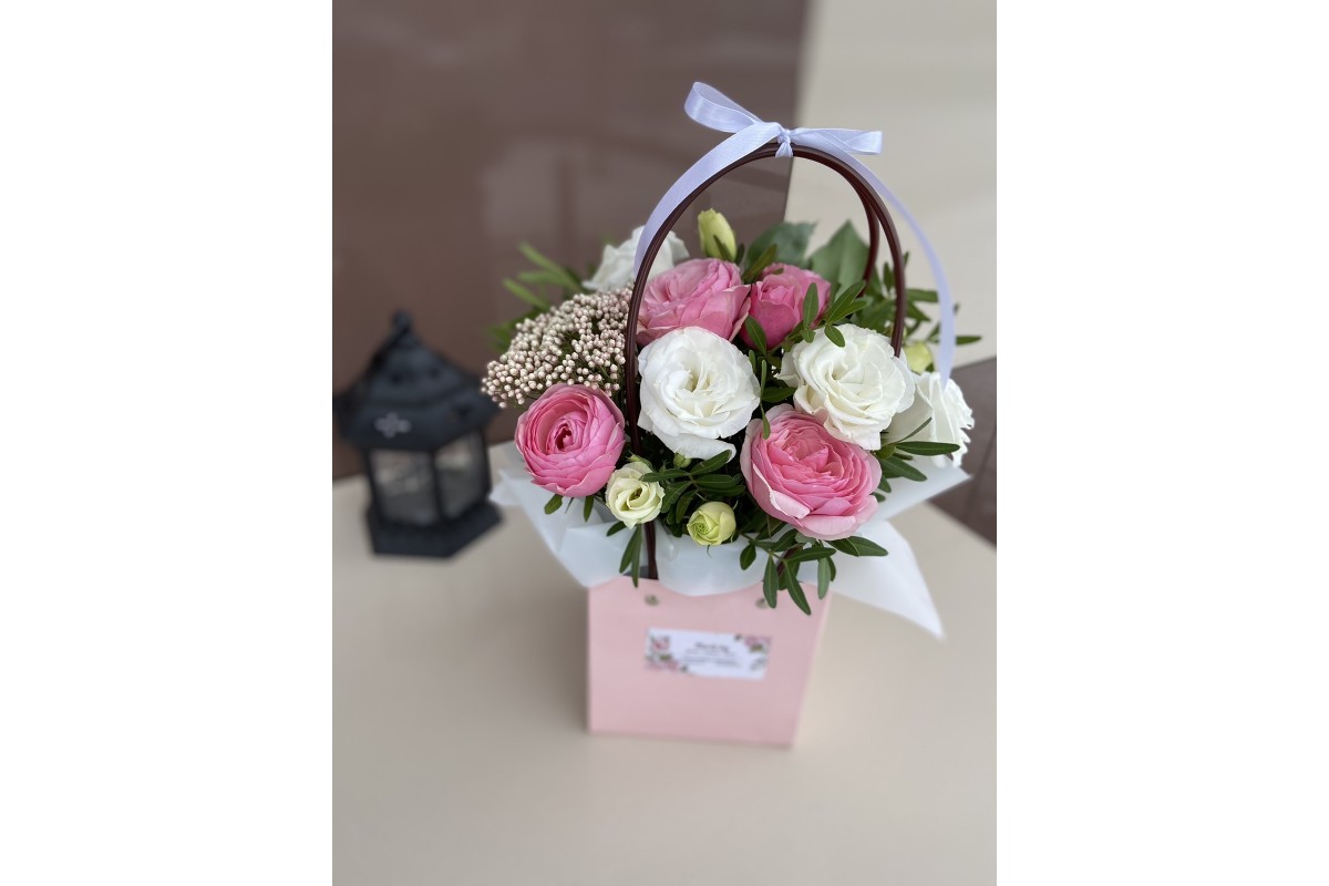 Состав: кустовая роза, эустома, озатамнус, зелень, лента, флористическая губка, корзина.