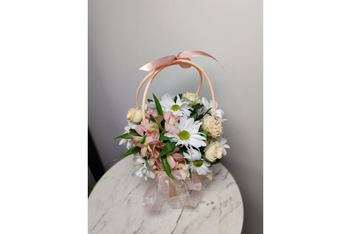 Состав: кустовая роза, хризантема, альстромерия, лента, флористическая губка, корзина.