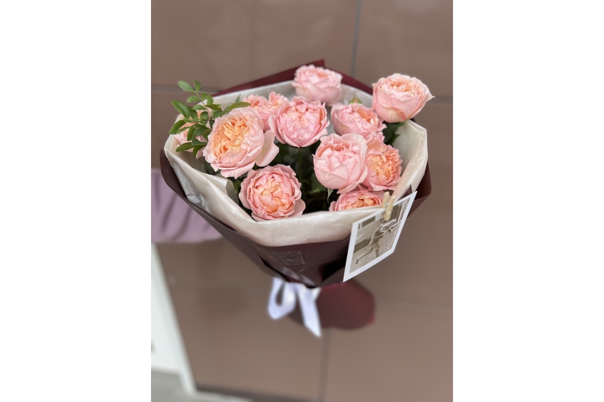 Состав:  Кустовая роза,зелень,упаковка, лента.
