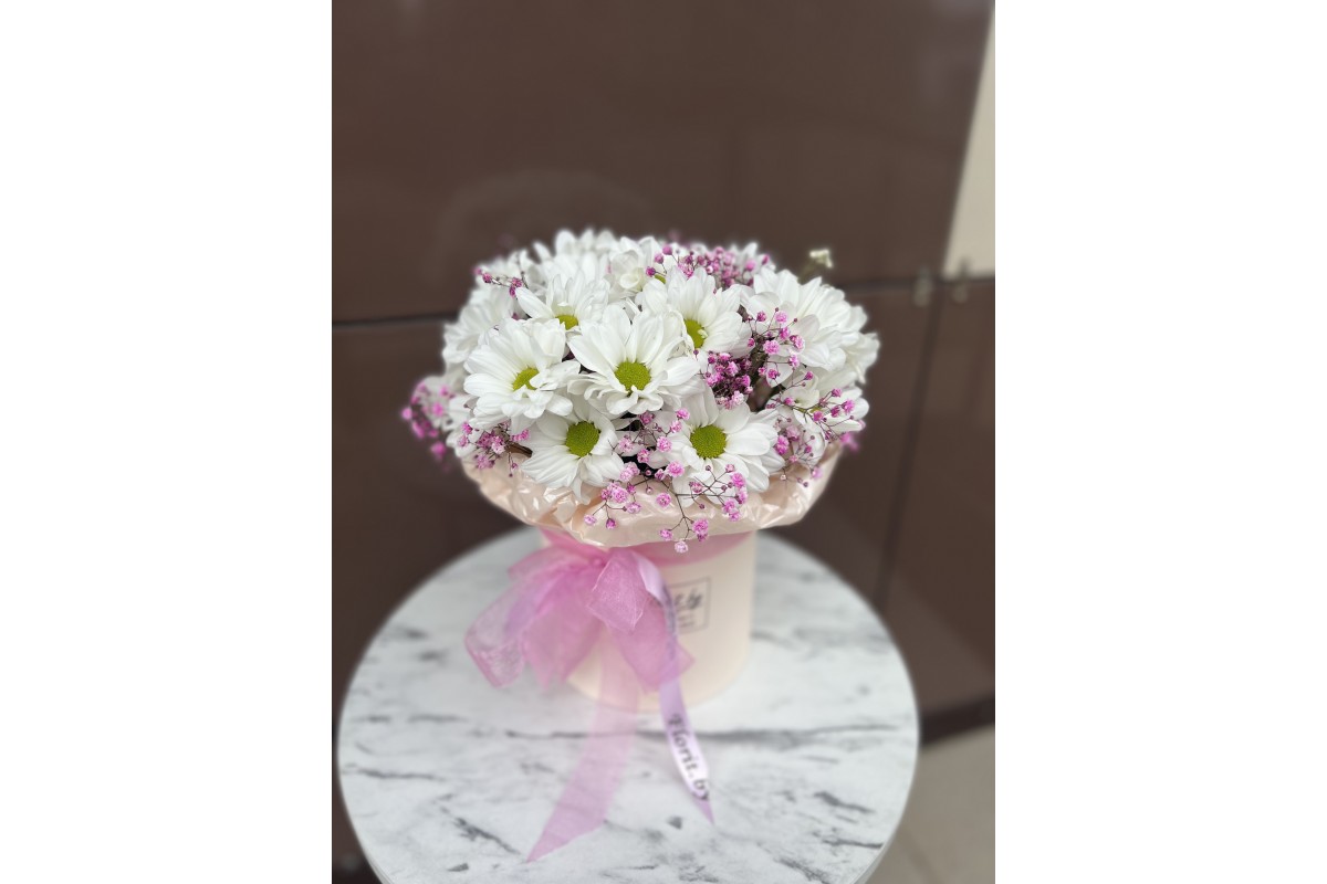 Состав:  Хризантема ромашковая, коробка, лента.